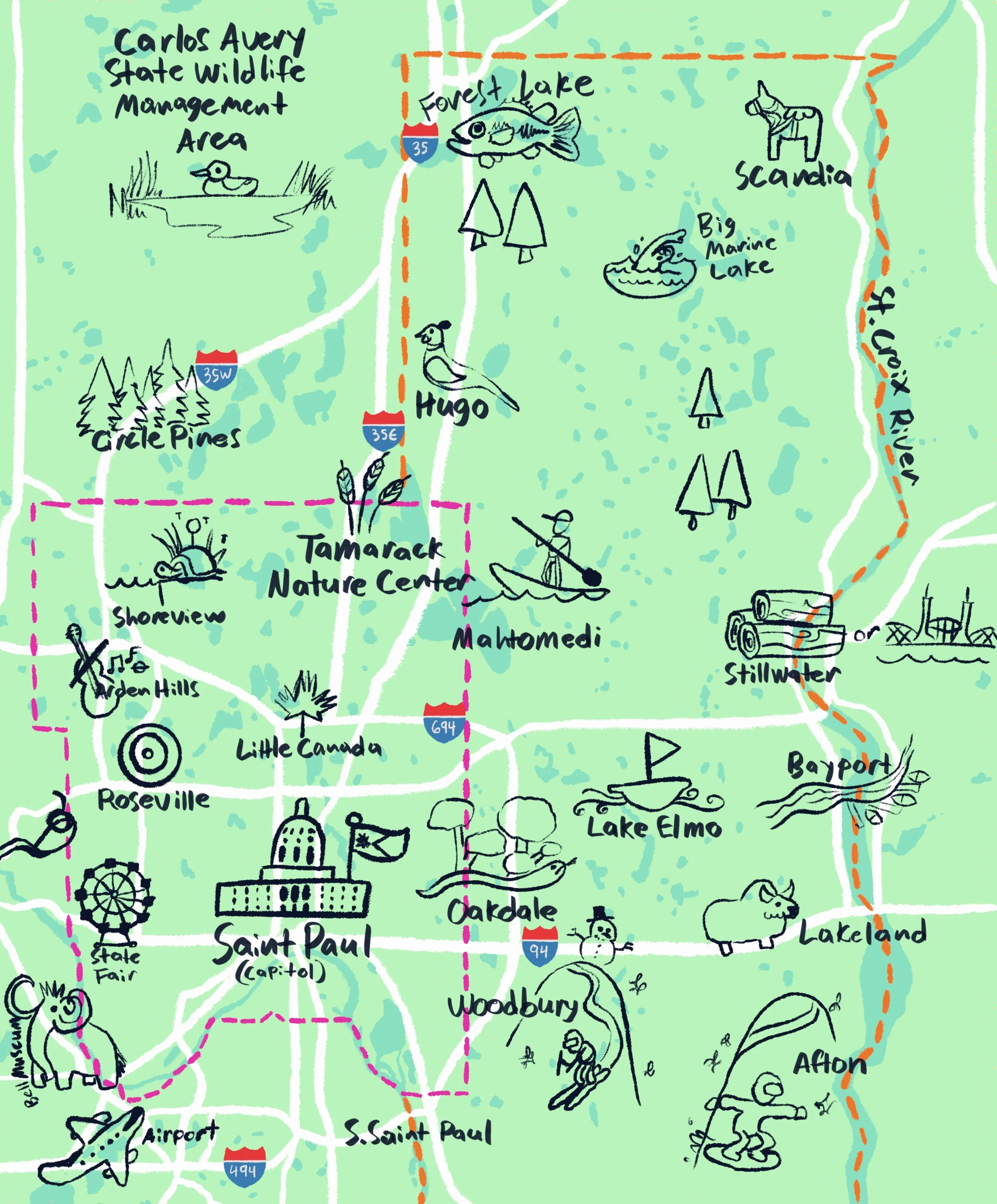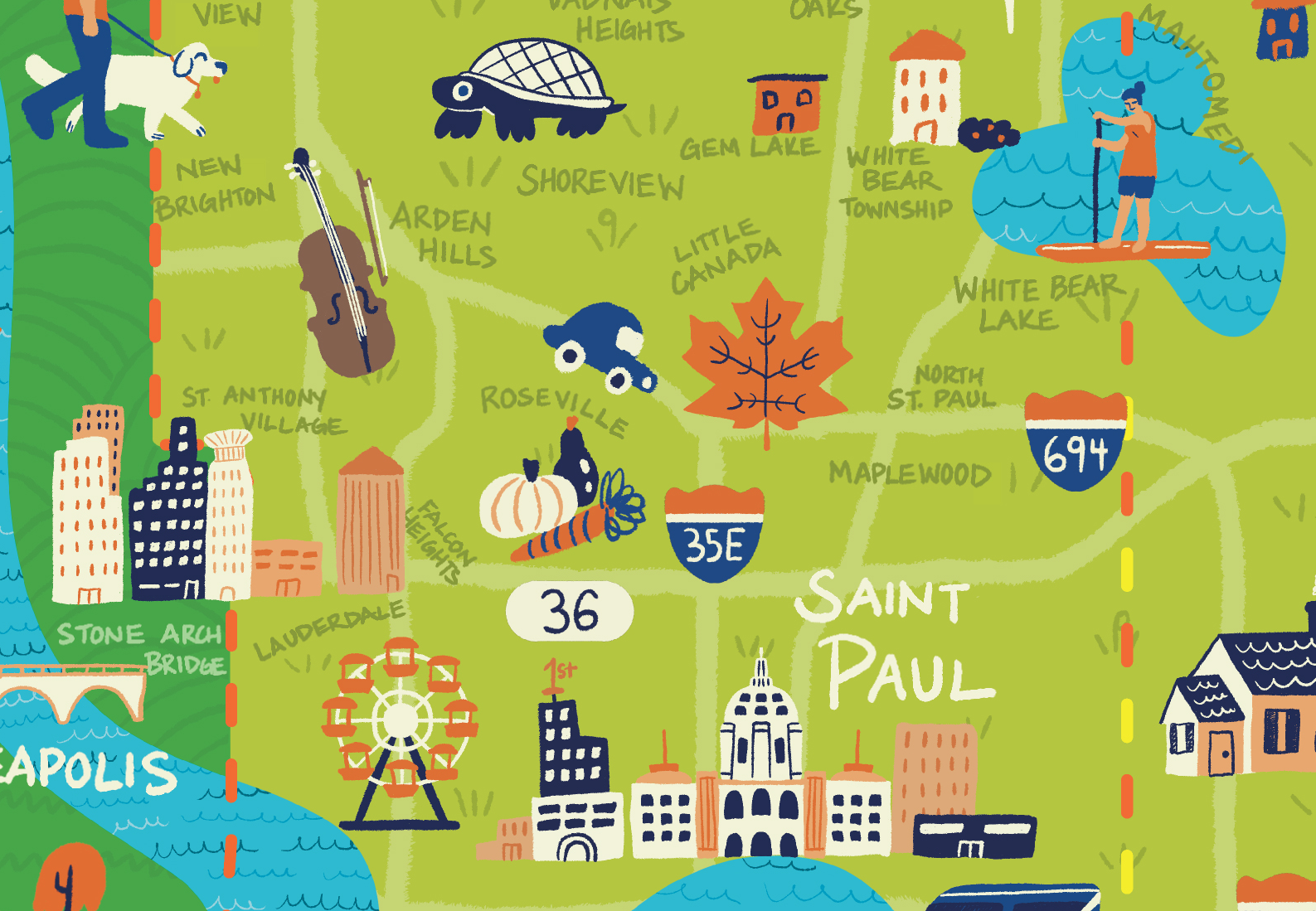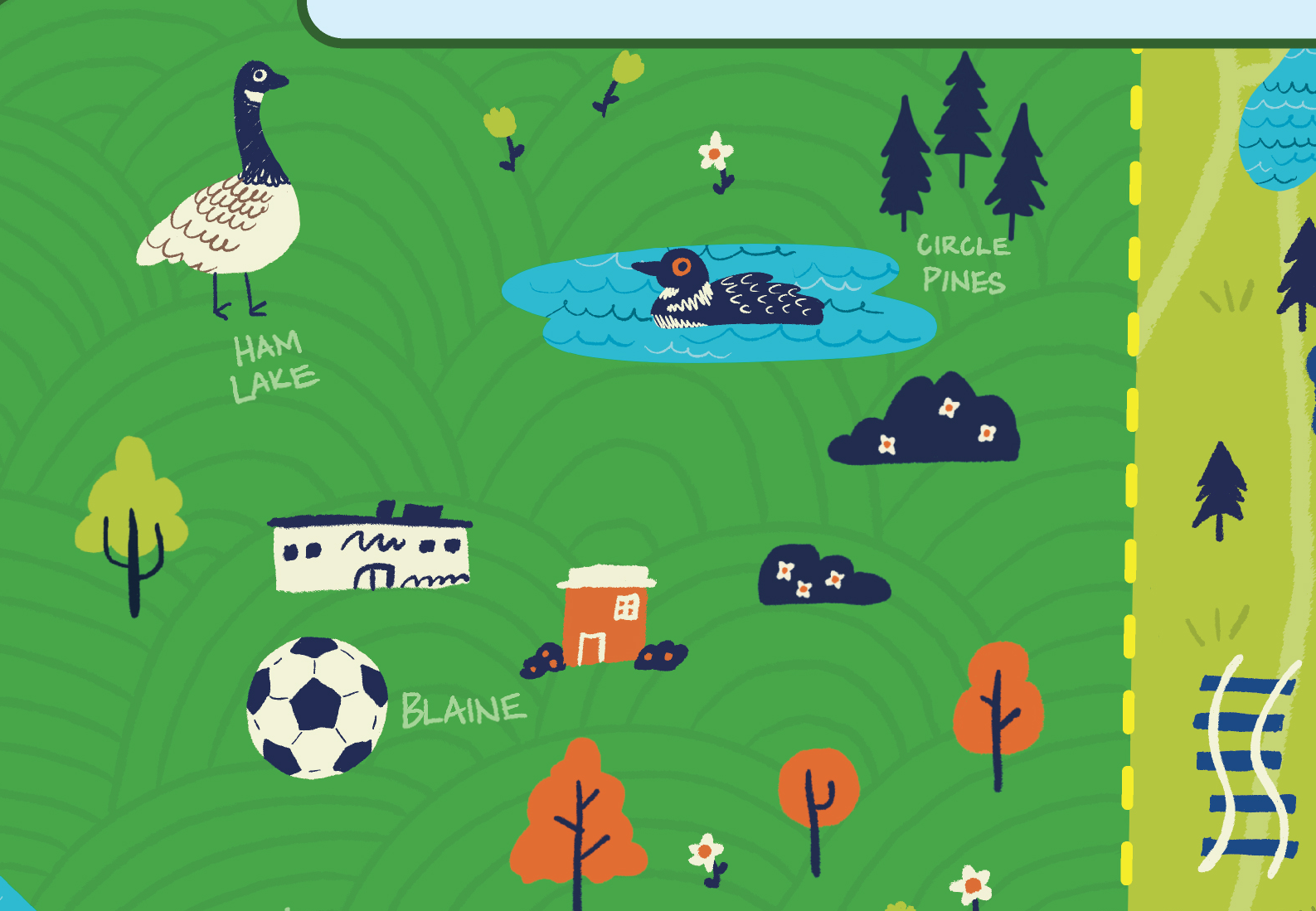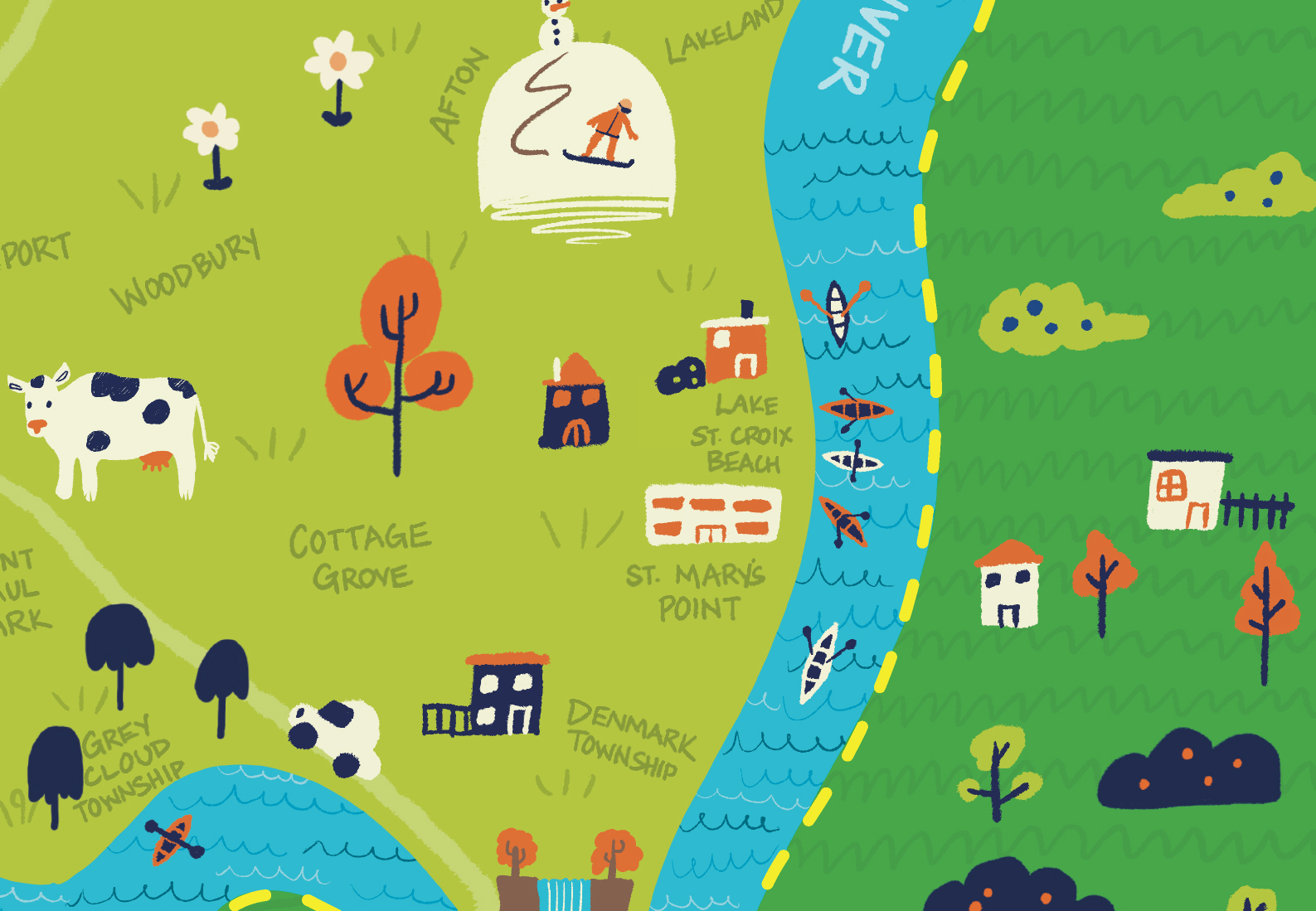 This project features an illustrated map of both Ramsey and Washington counties, to be used as a learning tool for young students visiting the Recycling and Energy Center.